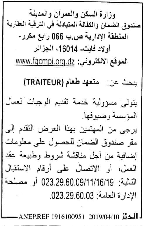 صندوق الضمان والكفالة المتبادلة في الترقية العقارية أولاد فايت الجزائر يبحث عن متعهد طعام أفريل 2019 مدونة التوظيف في الجزائر Dzemploi