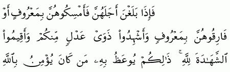 ف إ ذ ا ب ل غ ن أ ج ل ه ن ف أ م س ك وه ن ب م ع ر وف أ و ف ار ق وه ن ب م ع ر وف و أ ش ه د وا ذ و ي ع د ل م ن ك م و أ ق يم وا الش ه اد ة ل ل ه ذ ل ك م ي وع ظ ب ه م ن ك ان ي ؤ م ن ب الل ه و ال ي و م ال آخ ر و م ن ي ت ق